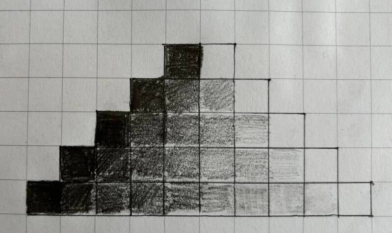 - Maak daarboven een balkje met 8 vakje, daarboven een balkje met 6 vakjes, enzovoort, tot het laatste balkje van 2 vakjes.