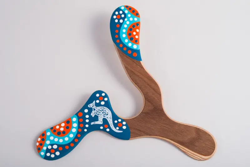 Misschien weet je wel dat de boemerang een Aboriginal uitvinding is; het is een voorwerp om mee te jagen. Door de juiste vorm te zagen en schuren van een stuk hout kan hij na weggooien een draai maken en zo de prooi uitschakelen.